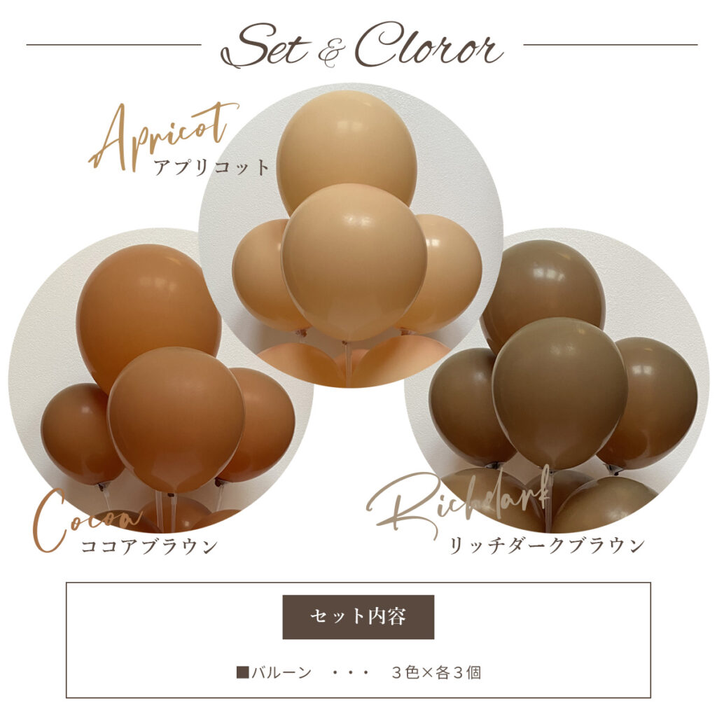 アプリコット・ココアブラウン・リッチダークブラウンの落ち着いた雰囲気のバルーンがインテリアに馴染みます。
