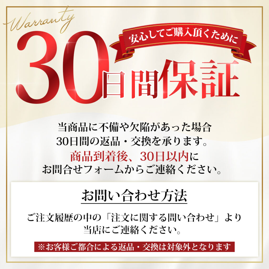 お客様に安心して楽しんでいただけるよう、使用・未使用に関わらず30日間の保障制度を整えております。