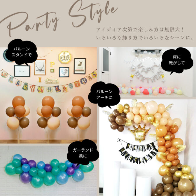 アプリコット・ココアブラウン・リッチダークブラウンの落ち着いた雰囲気のバルーンがインテリアに馴染みます。