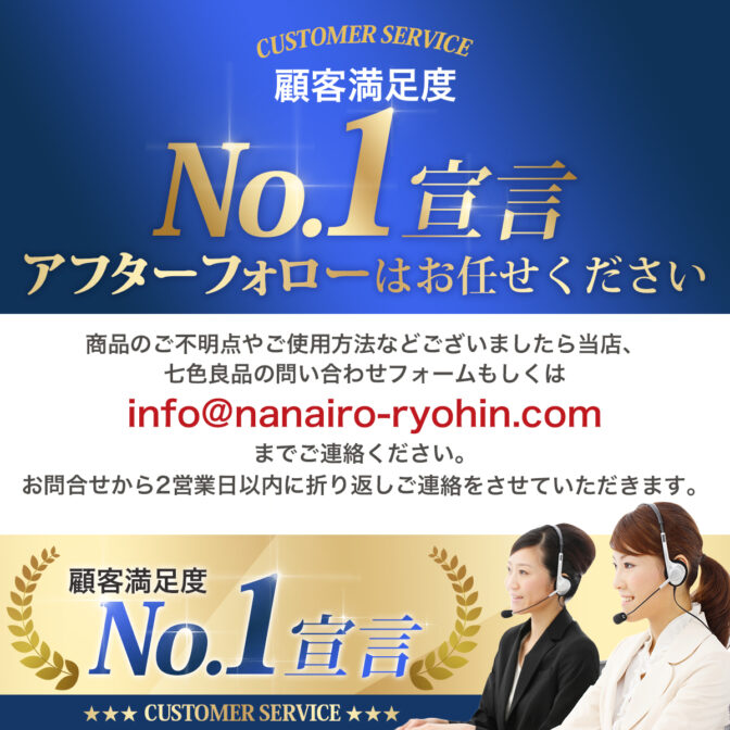 info@nanairo-ryohin.com お問い合わせのご返信は2営業日以内を心がけております。 数日経過致しましても当社からの返信がない場合は、ご入力いただいたメールアドレスに間違い、又はお客様のメールサーバーなどにより自動的に「迷惑メール」として格納または削除された可能性がございます。以上をご確認の上、お手数ですが再度お問い合わせください。 |